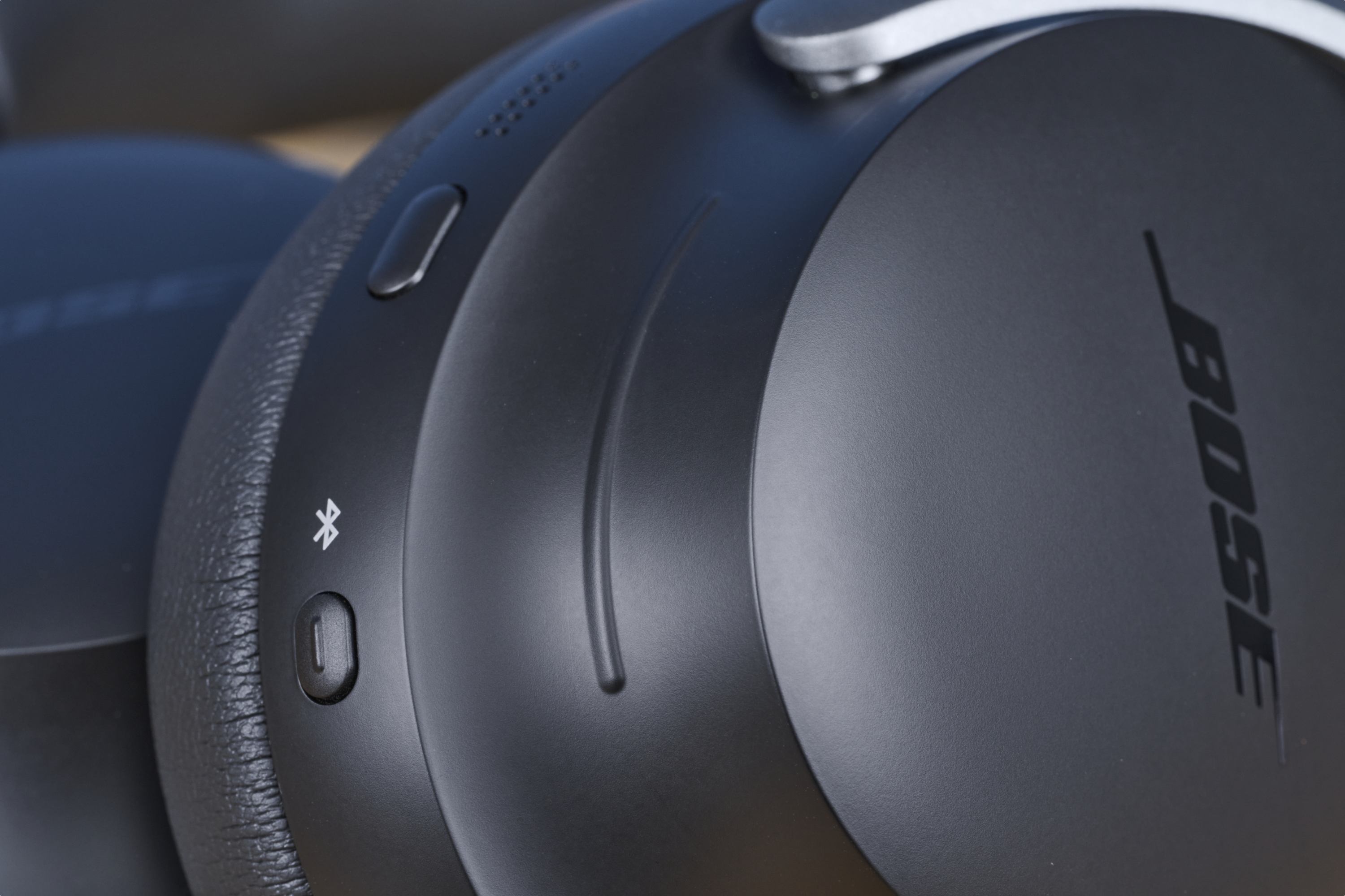 Tatsächlich verzichtet auch Bose nicht vollständig auf Touchbefehle. An der rechten Ohrmuschel kennzeichnet eine hervorgehobene Linie die Lautstärkeregelung. Wischst du darüber, wird die Musik leiser oder lauter. Ansonsten gibt es für alle Befehle einen echten Knopf. Einer schaltet den Kopfhörer ein und aus. Darüber sitzt die Multifunktionstaste. Ein Klick pausiert die Musik, zwei springen in der Playlist vorwärts, drei springen rückwärts.